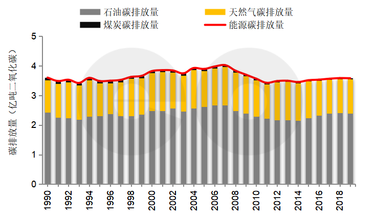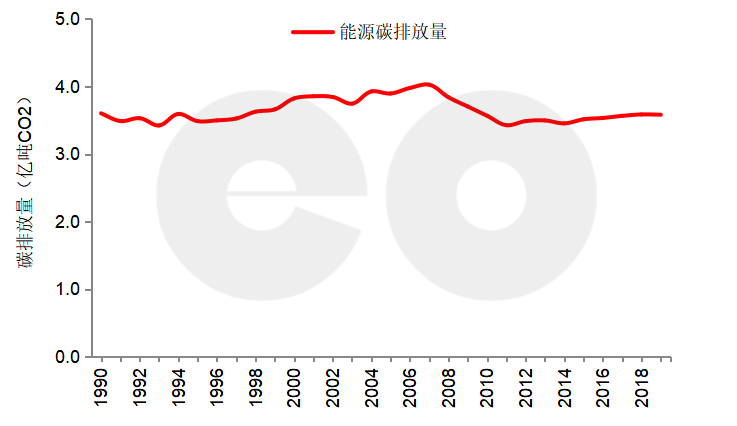近30年來,碳排放量在峰值附近窄幅波動(dòng)。能源碳排放量與化石能源消費(fèi)量及結(jié)構(gòu)相關(guān)。目前碳排放量為峰值年的89%,與1990年相當(dāng);2007年至今碳排放量年均下降1%。總體上看,近30年碳排放量波動(dòng)較小(見圖3)。未來,碳排放量雖然會(huì)有所波動(dòng),但都將處于下降通道。