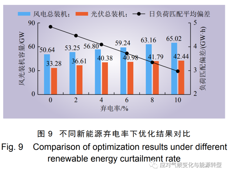 (4)假定儲(chǔ)能裝機(jī)規(guī)模 5 GW/10 GW·h,若新能源最大棄電率由 0 增加到 10% ,隨著棄電率上限的不斷增加,新能源的最優(yōu)接入容量也不斷增加,當(dāng)棄電率為 10% 時(shí),風(fēng)光容量達(dá)到最大值 65.02 GW 和 42.44 GW。并且風(fēng)電的增長(zhǎng)趨勢(shì)高于光伏,這也進(jìn)一步證實(shí)了大規(guī)模光伏較風(fēng)電更難以與負(fù)荷進(jìn)行匹配,系統(tǒng)更傾向于配置互補(bǔ)性更強(qiáng)的風(fēng)電。此外,隨著棄電率的增加,日負(fù)荷匹配平均偏差呈下降趨勢(shì),由4.84 GW·h 降至 2.98 GW·h,這說(shuō)明允許一定的棄電率可使系統(tǒng)發(fā)電功率與負(fù)荷形狀更容易匹配。