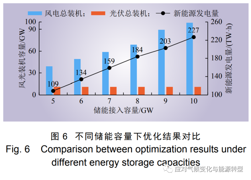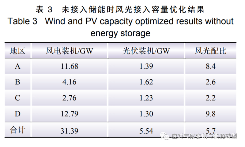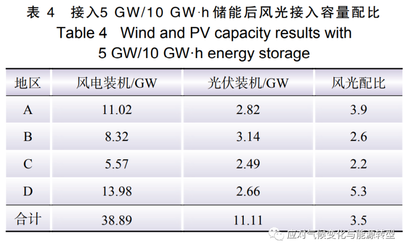 (3)論文的仿真結(jié)果顯示,由于風(fēng)電的利用小時(shí)數(shù)更高,廣域互補(bǔ)特性更強(qiáng),從源-荷匹配的角度來(lái)看,系統(tǒng)會(huì)優(yōu)先接納風(fēng)電(然而從各省已經(jīng)公布的“十四五”可再生能源規(guī)劃看,光伏的新增裝機(jī)容量普遍大于風(fēng)電。從全國(guó)總量上看,光伏新增裝機(jī)容量約為風(fēng)電的2倍,這與論文結(jié)論不太吻合。我們猜測(cè),各省能源主管部門在制定規(guī)劃時(shí),可能更多考慮的是光伏的多應(yīng)用場(chǎng)景和工程建設(shè)短平快的特點(diǎn),而對(duì)風(fēng)光資源的出力特性、互補(bǔ)特性以及系統(tǒng)的消納能力考慮不夠);由于光伏出力的日變化特性顯著,儲(chǔ)能與光伏的協(xié)調(diào)互補(bǔ)作用更加明顯,在接入儲(chǔ)能后系統(tǒng)的光伏接入容量會(huì)顯著增加(也就說(shuō),從風(fēng)光出力特性上看,光伏與儲(chǔ)能更加協(xié)調(diào)互補(bǔ),而風(fēng)電與“大電網(wǎng)”更加協(xié)調(diào)互補(bǔ))。