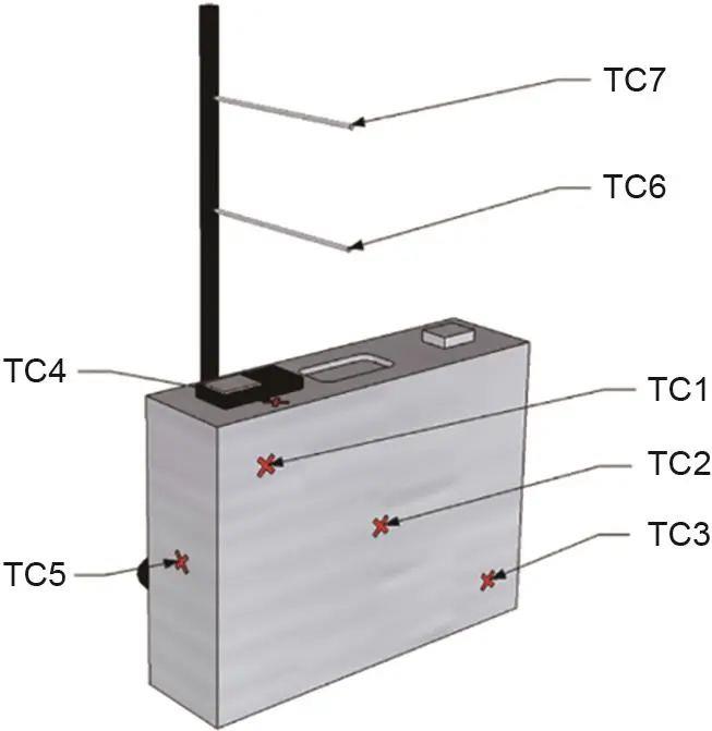 Xu等采用熱電偶對鋰離子電池火災及消防過程中的溫度變化進行了監(jiān)測,如圖7所示,他們一共安置了7枚熱電偶以便更全面可靠地檢測到電池表面溫度以及火焰溫度。從圖7中可以看到在電池的正表面沿對角線安置了3枚熱電偶,可以較全面地檢測正表面溫度。側(cè)面和頂部的熱電偶可以用于檢測電池的側(cè)面溫度和負極片附近的溫度。2枚置于泄壓閥上方的熱電偶可以監(jiān)測鋰離子電池燃燒過程中的火焰溫度和熱煙溫度。不過這種熱電偶的安置方式比較適合較大容量的方形電池,具體的熱電偶如何放置要根據(jù)電池的形狀和容量進行選擇。在方形電池的溫度檢測中,如果是容量較小的小型電池,側(cè)面和頂部的空間較小,不適合安置熱電偶,可將熱電偶安裝在正面。通常還是保持對角線的三枚熱電偶安置,并在數(shù)據(jù)處理的過程中采用其平均值作為鋰離子電池的表面溫度進行研究。
