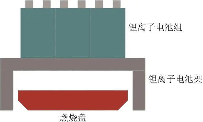 除加熱之外,通過外焰直接對電池進行點火也是電池燃燒試驗中經(jīng)常使用的引燃方式。這種方法的優(yōu)勢在于電池一旦出現(xiàn)泄氣行為會即刻被點燃,避免了出現(xiàn)爆炸的風險,且更有效地使電池進入燃燒的狀態(tài)。但由于火焰的內(nèi)外焰溫度并不完全一致,且灼燒面無法覆蓋整塊電池,導致電池受熱并不均勻,對熱失控的初期升溫階段可能會造成干擾。因此這種點燃觸發(fā)熱失控的方法更適合用于需要電池進入燃燒狀態(tài)的實驗,如關于消防策略、滅火劑等方向的研究。Li等在研究18650鈷酸鋰電池串并聯(lián)電池組燃燒及滅火特性的實驗中采用了明火引燃電池的方法。他們將一個裝有正庚烷的燃燒盆子置于電池架的底部(見圖6),隨后點燃燃燒盤,讓盤中的火焰灼燒置于電池架上的鋰離子電池直至電池進入熱失控狀態(tài)。但由于燃燒盤的火焰無法控制自行熄滅,當鋰離子電池進入燃燒狀態(tài)后,盤內(nèi)的火焰依然存在,對實驗的可靠性造成了一定程度的影響。為了避免外焰對后續(xù)電池的燃燒行為造成影響,可以從以下兩種思路進行改進:①通過使用本生燈之類的設備,當電池進入燃燒狀態(tài)后手動關閉燃料的輸送,使點火設備停止工作;②搭建機械控制裝置,在電池進入燃燒狀態(tài)后自動將外焰設備從電池附近移開。