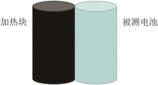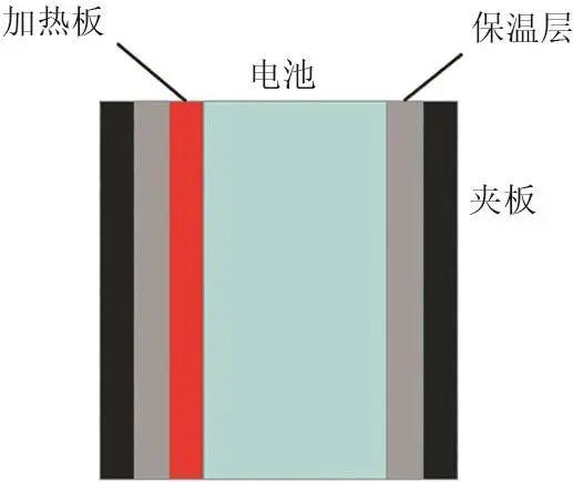 通過安置加熱塊對鋰離子電池進行加熱是最為常見的熱濫用方式,可以人為控制鋰離子電池熱失控初期的溫度變化趨勢和溫升速率,有效地對熱量累積階段的結(jié)構(gòu)及理化性質(zhì)的變化進行觀測,為智能消防系統(tǒng)中熱失控前期的變化模型提供數(shù)據(jù)支撐。Zhang等采用加熱方式誘導4 Ah的圓柱形電池進入熱失控。他們將一個與電池形狀相同的加熱塊與被測電池并排放置,如圖4所示,通過300 W的加熱塊將熱量傳遞給緊密接觸的被測電池。在加熱模塊中還加入了機械結(jié)構(gòu)的設計,當電池進入泄氣階段時即移開加熱塊,防止加熱塊的熱量對電池產(chǎn)熱情況造成干擾,影響數(shù)據(jù)的可靠性。Mao等同樣采用加熱塊誘發(fā)300 Ah的鋰離子電池的熱失控,從而對燃燒行為進行研究。研究中采用的是帶殼體的方形電池,需要用夾板將電池與加熱板緊密貼合,如圖5所示。但為了保證加熱板與電池的緊密貼合,在該機構(gòu)的設計中采用了夾具將加熱板、電池等部件固定,導致電池在出現(xiàn)電池泄氣行為后加熱板不便于移開,所以采用對加熱板斷電的方式減少額外熱量對鋰離子電池熱失控后續(xù)行為的干擾。