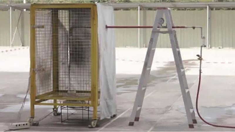 在鋰離子電池熱失控及燃燒的研究中,人們通常會引入特制箱體作為實驗開展的載具,該設計不僅可以阻止電池燃燒時產(chǎn)生的火焰以及爆炸對周圍環(huán)境和人員造成威脅,而且在一定程度上可模擬電池實際工況,提高數(shù)據(jù)的可靠性。通常箱體設計有兩個模式,一種是封閉式,如圖1所示,封閉式箱體設計對附近的研究人員具有更高的保護能力,同時由于燃燒產(chǎn)生的物質(zhì)和熱量難以擴散到外界環(huán)境,研究電池熱失控的產(chǎn)氣、產(chǎn)熱等行為具有更高的可靠性;另一種模式是開放式,如圖2所示,為了避免電池爆炸產(chǎn)生的碎屑等內(nèi)容物濺射對研究人員造成傷害,需安裝防護網(wǎng)等進行遮擋。盡管開放式箱體在設計上具有相對較高的自由度,但需要具備搭載研究中必要的元件,如引燃設備、各類數(shù)據(jù)監(jiān)測設備等。