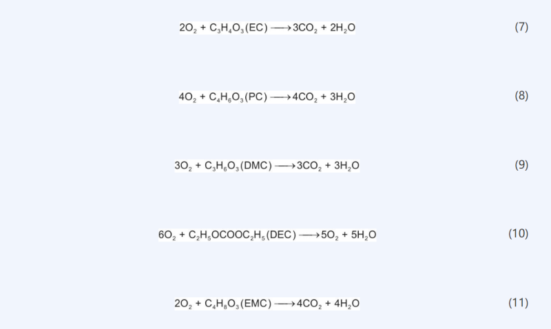 當溫度繼續(xù)升高到130~180 ℃區(qū)間時,隔膜融化,電池將出現(xiàn)內(nèi)短路,產(chǎn)生大量的焦耳熱,此時電池自發(fā)產(chǎn)熱,進入熱失控狀態(tài)。值得注意的是,此時電池內(nèi)部產(chǎn)生熱量以及產(chǎn)生的速率與電池荷電狀態(tài)(state of charge,SOC)成正相關。當溫度達到200 ℃以上時,正極材料開始發(fā)生劇烈的分解反應,產(chǎn)生大量的熱并釋放出氧氣,這些氧氣還將和電解質(zhì)發(fā)生如下反應,進一步放出大量的熱。