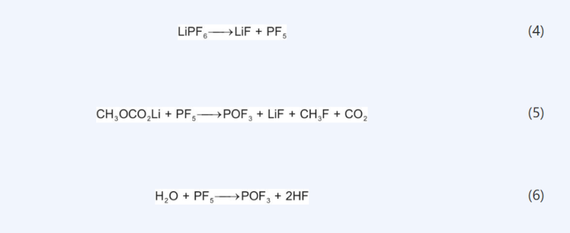 在此溫度下,電解質(zhì)中的鹽還會發(fā)生熱解與水解,生成PF5、POF3、CH3F和HF等有毒害氣體,反應如下