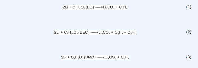 為了更深入地研究鋰離子電池熱失控情況,研究人員在這三個階段的基礎上進一步細化,對電池熱失控的全過程進行了更細致的劃分。當電池溫度僅處于60~80 ℃時,輕微的產(chǎn)氣行為就已經(jīng)開始發(fā)生,當溫度達到90 ℃時,固態(tài)電解質(zhì)界面膜SEI(solid electrolyte interphase)發(fā)生重構(gòu)。當溫度進一步提高到100~140 ℃,SEI膜結(jié)構(gòu)開始被破壞,發(fā)生分解反應。在此階段,由于SEI膜被破壞導致Li負極與電解質(zhì)發(fā)生直接接觸,在高溫情況下會產(chǎn)生乙烯和乙烷等可燃性氣體,進一步破壞電極結(jié)構(gòu),加劇副反應,反應方程式如下