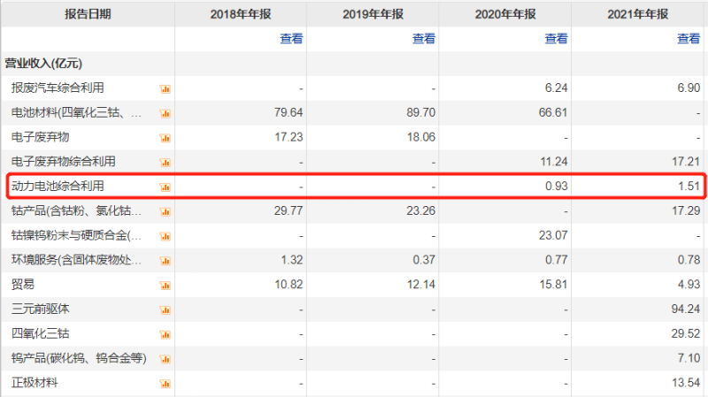 但是公司精心布局近六年的動力電池回收業(yè)務占比不足1%?拆分2021年公司營收占比,公司動力電池回收業(yè)務營業(yè)收入1.51億元,同比增長61.63%,卻僅占總營收的0.78%。