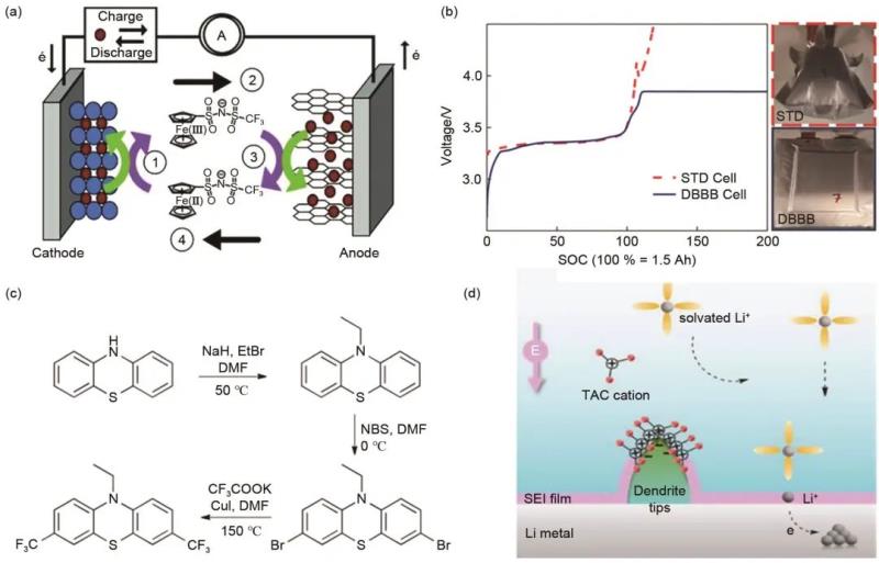 圖12 (a) 二茂鐵基氧化還原穿梭劑機理示意圖; (b) 在沒有和添加0.4 mol/L DBBB情況下,石墨/C-LFP袋電池的充電電壓曲線; (c) 三步法合成N-乙基-3,7-雙(三氟甲基)吩噻嗪; (d) TAC陽離子靜電屏蔽機理