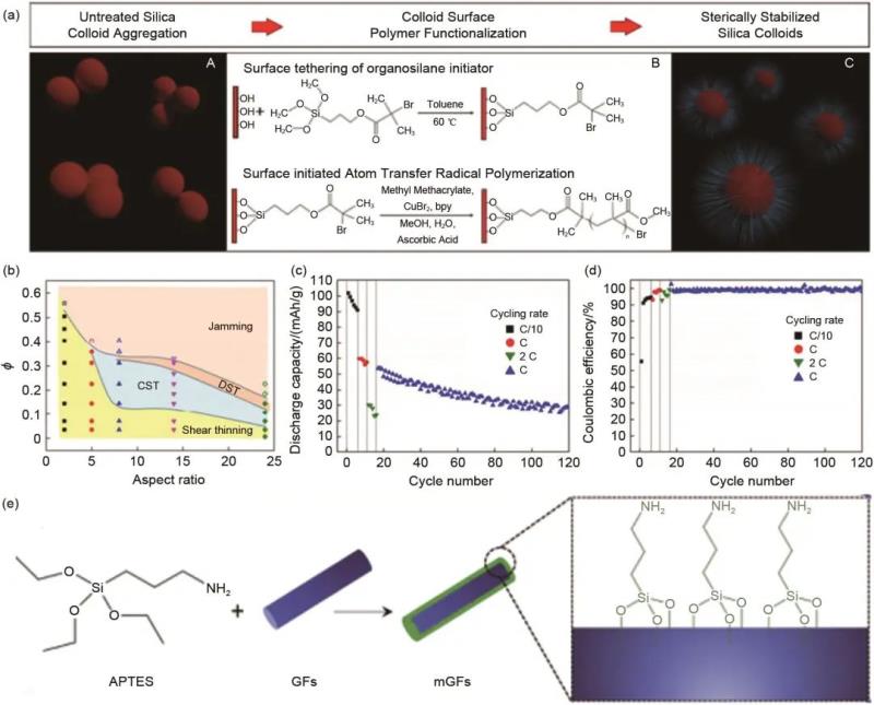 圖9 (a) A為裸露的二氧化硅納米顆粒在溶液中的聚集示意圖,B為有機硅在二氧化硅膠體表面的附著(上)和通過電子轉移原子轉移自由基聚合再生的表面引發(fā)催化劑在膠體表面接枝聚甲基丙烯酸甲酯(PMMA)的方案(下),C為通過表面接枝PMMA而穩(wěn)定的二氧化硅納米顆粒示意圖;(b) 含有不同長徑比和體積分數硅納米棒電池電解液的流變圖;組裝的全電池,NMC|EC/EMC/LiTFSI/33%·AR(5)·SiO2納米棒|石墨,在C/10、1 C、2 C和1 C下循環(huán)時放電容量圖(c)和庫侖效率變化圖(d);(e) mGFs制備過程