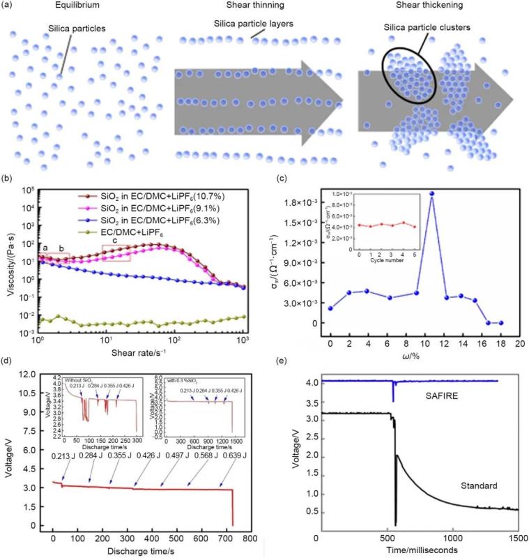 圖8 (a) 不同狀態(tài)下氣相二氧化硅顆粒在液體電解質中的分布;(b) 不含SiO2的電解質和含有6.3% SiO2、9.1% SiO2和10.7% SiO2的復合電解質的流變圖;(c) 室溫下復合電解質(SiO2/LiPF6/EC/DMC)離子電導率隨氣相二氧化硅質量分數的變化。插圖為含有9.1% SiO2的復合電解質沖擊試驗后的離子電導率;(d) LiFePO4電極在含9.1% SiO2的STF電解液中的放電曲線;(e) 是否使用剪切增稠電解液的電池電壓變化