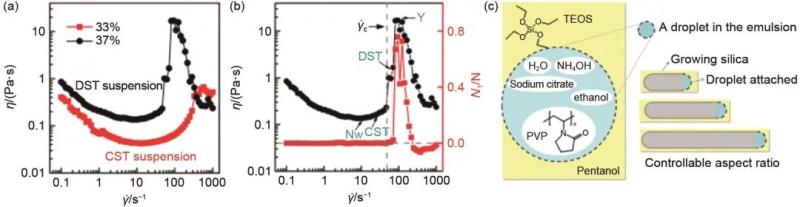 圖7 (a) 不同體積分數下黏度與剪切速率的關系;(b) 摻雜物質量分數為37%的懸濁液的黏度和法向力與剪切速率的關系;(c)以正硅酸乙酯(TEOS),檸檬酸鈉、聚乙烯吡咯烷酮(PVP)、氫氧化銨、乙醇和戊醇為原料,采用乳液法合成了長徑比可控的二氧化硅納米棒