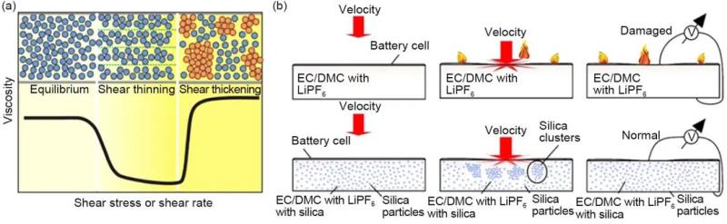 剪切增稠是一種非牛頓力學行為,即流體黏度隨剪切速率的增加呈現(xiàn)顯著和短暫的非線性增加。剪切增稠流體(STFs)是一種非牛頓流體,由剛性膠體粒子溶解在惰性載體溶液中形成,當剪切速率超過臨界剪切速率時,剪切黏度會急劇增加,保護受到動態(tài)沖擊的鋰電池。