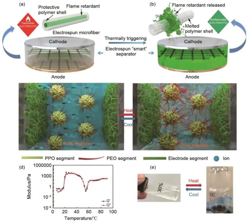 圖5 (a) 由芯殼結構(阻燃劑為芯,聚合物為殼)組成的具有熱觸發(fā)阻燃性能的隔膜示意圖;(b) 熱觸發(fā)后,聚合物外殼熔化,封裝的阻燃劑釋放到電解液中,有效地抑制了電解液的著火和燃燒;(c) 溶膠-凝膠轉變示意圖(加熱時熱塑性彈性體溶液由溶膠態(tài)轉變?yōu)槟z態(tài),抑制離子的運動,在高溫下主動關閉設備);(d) 30% Pluronic溶液的流變行為隨溫度的變化;(e) 溶膠和凝膠狀態(tài)下的Pluronic溶液