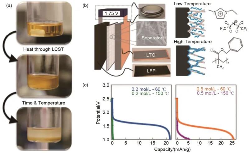 圖4 (a) PEO/IL相分離的照片;(b) 電池組裝示意圖以及聚合物PBMA和離子液體[EMIM][TFSI]的結構和電極表面高溫下的熱響應機制;(c) 以LTO/LFP為電極、5% PBMA和0.2 mol/L/0.5 mol/L LiTFSI/[EMIM][TFSI]組成的電池在60 ℃和150 ℃下的電化學性能