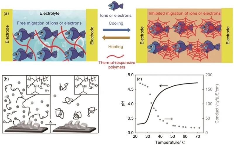 具有熱響應特性的聚合物為防止電池熱失控提供了可行和可逆的策略。當這種熱響應性聚合物用作電解質時能夠對溫度進行響應,溫度升高至超過臨界值后聚合物分子構象發(fā)生可逆變化。這種構象變化導致聚合物本身的離子電導率降低、鋰電池的電荷轉移阻抗增加,從而防止了熱失控的發(fā)生。當溫度降低后,熱敏聚合物可以重新溶解在電解質中,恢復其離子導電性,如圖3(a)所示。