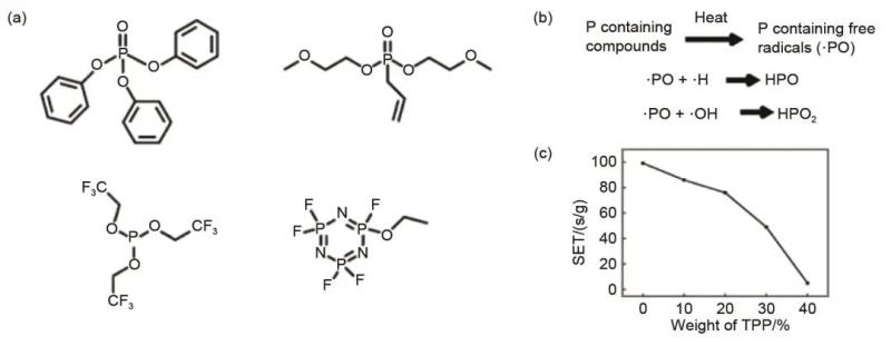 圖2 (a) 阻燃劑的典型分子結構;(b) 含磷化合物的阻燃機理;(c) 商用電解液加入磷酸三苯酯(TPP)后自熄時間隨TPP質量分數增加而顯著降低