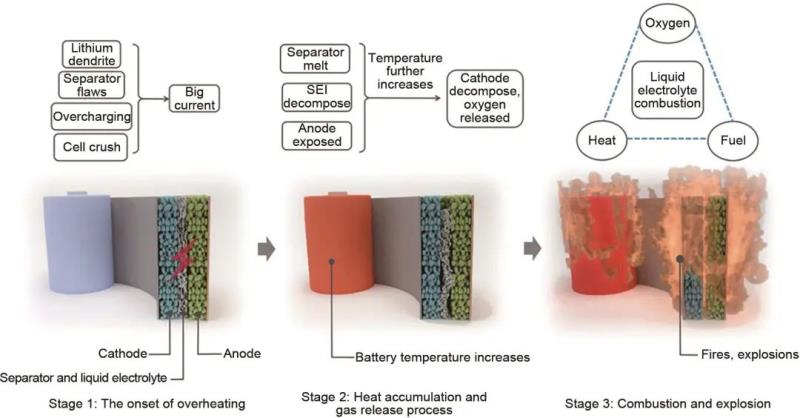圖1 熱失控過程分為三個階段。第一階段:過熱出現(xiàn)。電池由正常狀態(tài)變?yōu)楫惓顟B(tài),內部溫度開始升高;第二階段:熱量聚集和氣體釋放。電池內部溫度迅速上升,并發(fā)生放熱反應;第三階段:燃燒與爆炸。易燃的電解液會燃燒,導致火災甚至爆炸