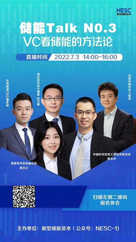 中國(guó)儲(chǔ)能網(wǎng)訊:7月3日下午14:00-16:00,我們將邀請(qǐng)清新資本投資副總監(jiān)龔芷以做“VC看儲(chǔ)能的方法論”主題演講,并邀請(qǐng)光速中國(guó)合伙人蔡偉、海松資本執(zhí)行董事趙文健、樂駕能源CEO潘多昭和中國(guó)化學(xué)與物理電源學(xué)會(huì)儲(chǔ)能應(yīng)用分會(huì)副秘書長(zhǎng)、中科院電工所研究員陳永翀來做對(duì)話討論。