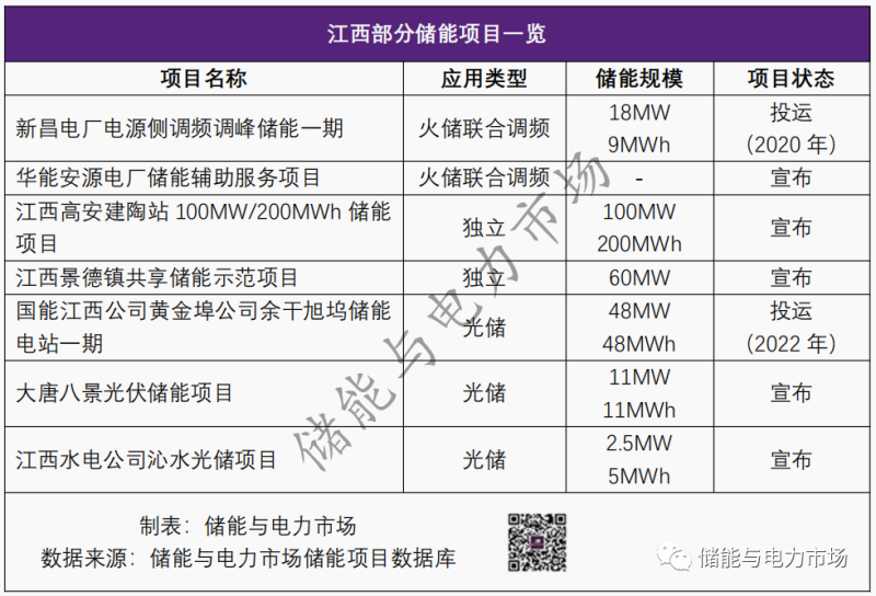 江西省部分儲(chǔ)能項(xiàng)目如下表所示。