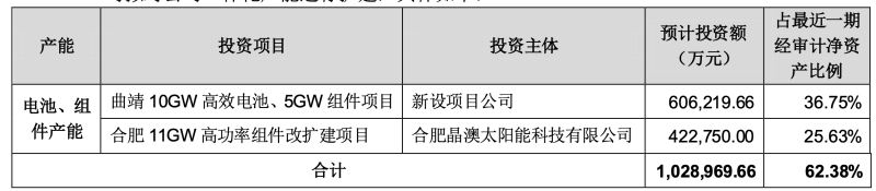 上述定增中晶澳科技對(duì)HJT路線的投入,遠(yuǎn)比不上它近期規(guī)劃的對(duì)TOPCon電池產(chǎn)線的投入。5月18日,晶澳科技發(fā)公告稱,公司預(yù)計(jì)投資102.9億元建設(shè)“曲靖10GW高效電池、5GW組件項(xiàng)目”和“合肥11GW高功率組件改擴(kuò)建項(xiàng)目”。其中,對(duì)“曲靖10GW高效電池、5GW組件項(xiàng)目”的投資額為60.62億元。