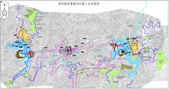 來(lái)賓抽水蓄能電站初選裝機(jī)1200MW,額定水頭478m,上水庫(kù)位于大瑤山東麓忠良鄉(xiāng)三合村三界組南西向峽谷中,集水面積2.96km2,初擬混凝土面板堆石壩,最大壩高81米。下水庫(kù)位于忠良鄉(xiāng)中山村金段屯忠良河上游溝谷中,集水面積為積14.5km2。初擬混凝土心墻堆石壩,最大壩高79米。