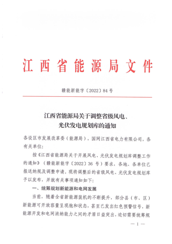 中國儲能網(wǎng)訊:7月1日,江西省能源局印發(fā)《關(guān)于調(diào)整省級風(fēng)電、光伏發(fā)電規(guī)劃庫的知》,就統(tǒng)籌規(guī)劃新能源和電網(wǎng)發(fā)展,引導(dǎo)企業(yè)有序開發(fā)理性投資給出相關(guān)要求。