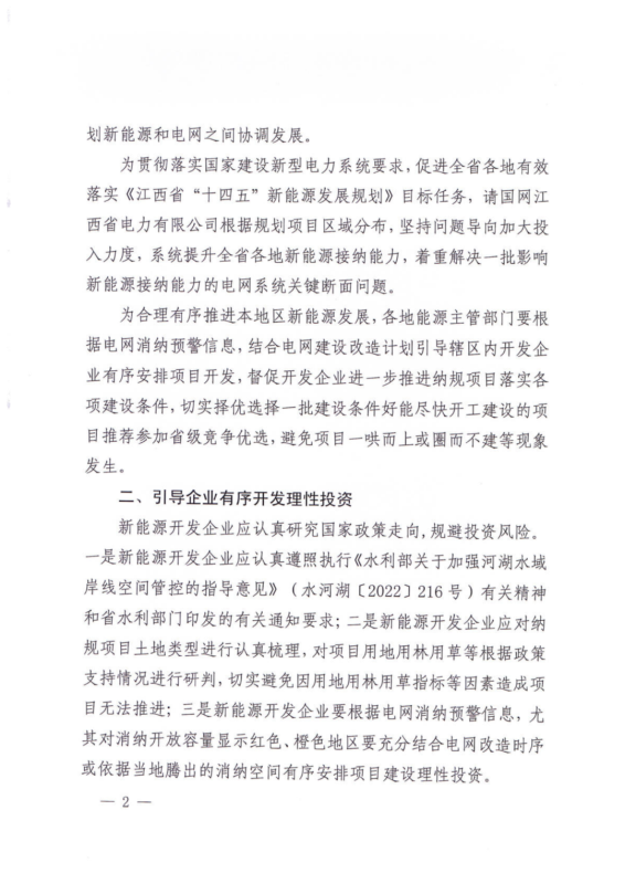 文件強調(diào),新能源開發(fā)企業(yè)應(yīng)認(rèn)真遵照執(zhí)行《水利部關(guān)于加強河湖水域岸線空間管控的指導(dǎo)意見》(水河湖〔2022〕216號)有關(guān)精神和省水利部門印發(fā)的有關(guān)通知要求;二是新能源開發(fā)企業(yè)應(yīng)對納規(guī)項目土地類型進行認(rèn)真梳理,對項目用地用林用草等根據(jù)政策支持情況進行研判,切實避免因用地用林用草指標(biāo)等因素造成項目無法推進;三是新能源開發(fā)企業(yè)要根據(jù)電網(wǎng)消納預(yù)警信息,尤其對消納開放容量顯示紅色、橙色地區(qū)要充分結(jié)合電網(wǎng)改造時序或依據(jù)當(dāng)?shù)仳v出的消納空間有序安排項目建設(shè)理性投資。