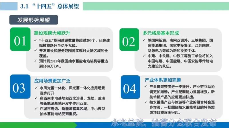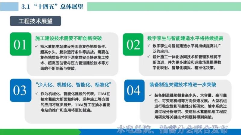 (3)應用場景更加廣泛。在傳統(tǒng)的應用場景基礎上,水風光蓄一體化,風光蓄一體化應用場景將逐步打開,抽水蓄能在西南水電基地和西北沙漠、胳膊、荒漠等大型新能源基地開發(fā)中儲能作用凸顯。在城市周邊、新能源富集區(qū)域,中小抽水蓄能電站、小微抽水蓄能電站的建設應用更加廣泛,多類型、多場景的抽水蓄能應用格局將逐步顯現(xiàn)。