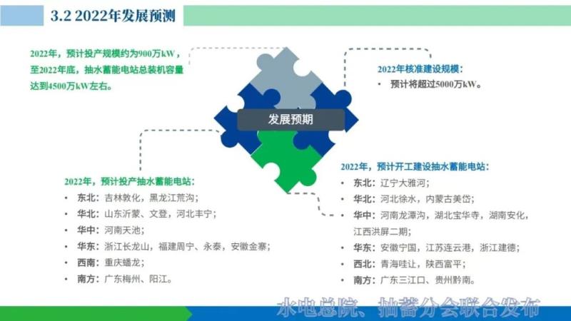 《抽水蓄能產業(yè)發(fā)展報告》預測,2022年,預計安徽寧國、江蘇連云港、浙江建德、廣東三江口、貴州黔南、河北徐水、河南龍?zhí)稖?、湖北寶華寺、湖南安化、江西洪屏二期、遼寧大雅河、內蒙古烏海、青海哇讓、陜西富平等項目將核準建設,核準規(guī)模將超過5000萬千瓦。2022年,預計吉林敦化,黑龍江荒溝,浙江長龍山,山東沂蒙、文登,河北豐寧,廣東梅州、陽江,福建周寧、永泰,安徽金寨,河南天池,重慶蟠龍等在建抽水蓄能電站部分機組將投產發(fā)電,投產規(guī)模約為900萬千瓦。而至2022年年底,抽水蓄能電站總裝機容量達到4500萬千瓦。