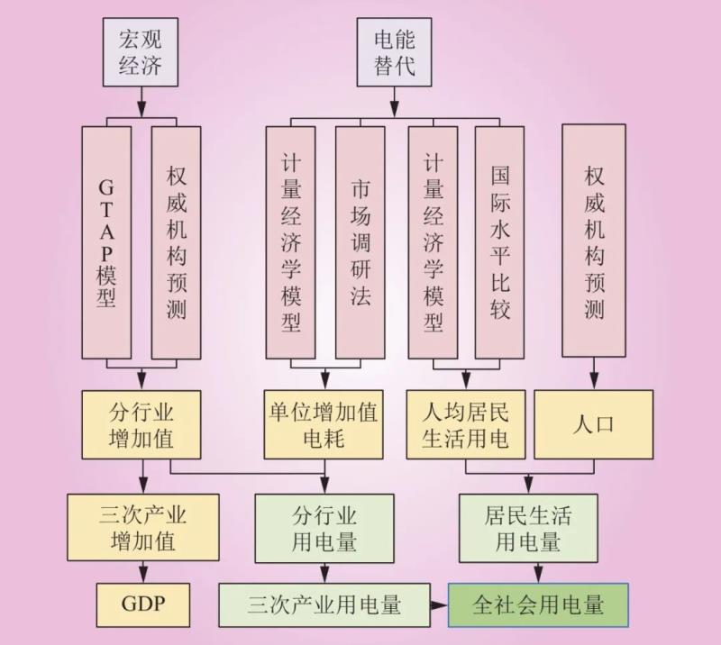 (3)全社會(huì)用電量根據(jù)各部門(mén)預(yù)測(cè)結(jié)果匯總。基于分行業(yè)用電量,按照行業(yè)屬性求和計(jì)算三次產(chǎn)業(yè)用電量,再結(jié)合居民生活用電量,得到“十四五”期間中國(guó)全社會(huì)用電量預(yù)測(cè)結(jié)果。