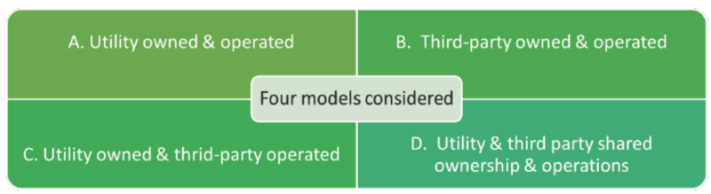 本節(jié)回顧了四種可能的業(yè)務(wù)模式,這些業(yè)務(wù)模式與儲能系統(tǒng)的所有權(quán)有關(guān),目的是儲能系統(tǒng)可以作為配電系統(tǒng)的一種非線纜替代方案(NWA)。這些模型是根據(jù)加拿大儲能協(xié)會的成員意見定義的。加拿大儲能協(xié)會并不認可一種特定的模式,而是探索每種模式的潛在機遇和挑戰(zhàn)。而提出的每個模型可能是相互排斥的,并提供了受監(jiān)管的本地配電公司作為公用事業(yè)公司和儲能開發(fā)商作為第三方的觀點。