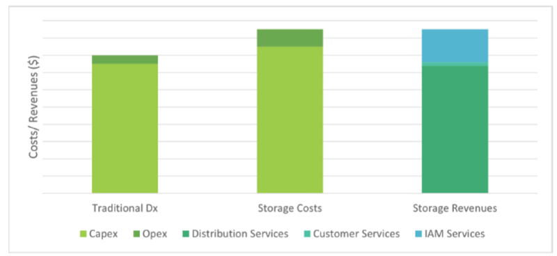 如圖1所示,相對于儲能系統(tǒng)來說,傳統(tǒng)配電設(shè)施投資的前期成本可能較低,但如果實現(xiàn)了安大略省獨立電力系統(tǒng)運營商(IESO)管理的批發(fā)市場(IAM)和其他服務(wù)的收入抵消,那么儲能資產(chǎn)的凈成本也可能低于傳統(tǒng)配電投資。