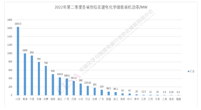 圖1  2022Q2電化學(xué)儲(chǔ)能裝機(jī)功率各省份分布