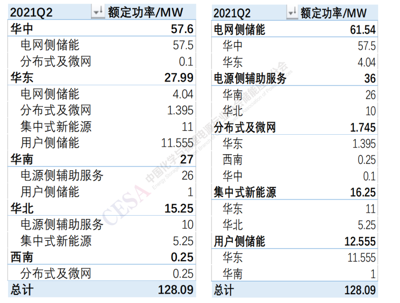 2021年第二季度電化學(xué)儲(chǔ)能項(xiàng)目裝機(jī)中電網(wǎng)側(cè)儲(chǔ)能主要集中在華中和華東區(qū)域,電源側(cè)輔助服務(wù)主要集中在華南和華北區(qū)域。