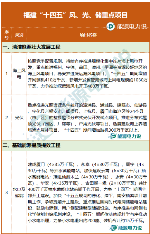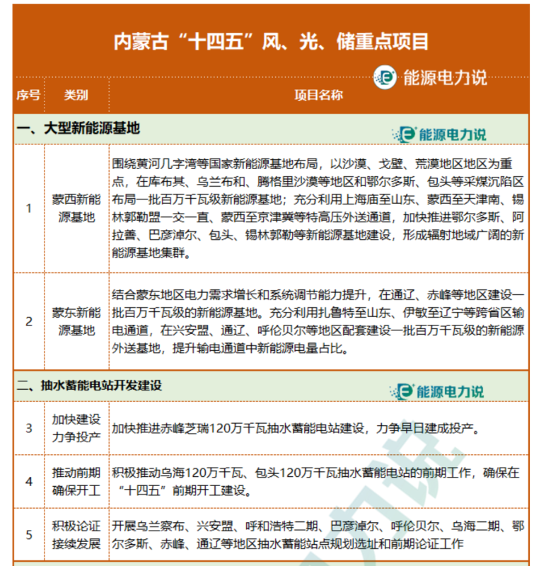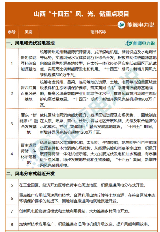 “十四五”風(fēng)、光、儲重點項目包括大型新能源基地、抽水蓄能電站開發(fā)建設(shè)、國家級新能源電力供應(yīng)保障基地、可再生能源應(yīng)用場景擴展工程、美麗鄉(xiāng)村新能源支撐工程等方向。