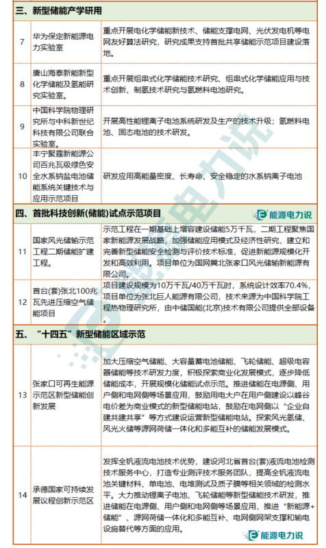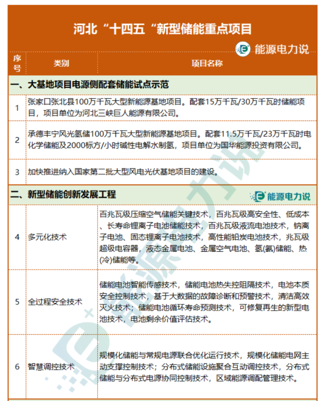 4月10日,河北發(fā)改委發(fā)布《河北省“十四五”新型儲能發(fā)展規(guī)劃》,明確了新型儲能發(fā)展目標(biāo)及重點項目方向。其中在大基地項目電源側(cè)配套儲能試點示范方面,確定了張家口張北縣100萬千瓦大型新能源基地項目、承德豐寧風(fēng)光氫儲100萬千瓦大型新能源基地項目。