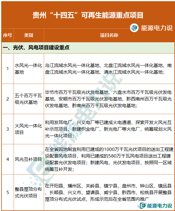 4月19日,貴州發(fā)改委、能源局發(fā)布《貴州省新能源和可再生能源發(fā)展“十四五”規(guī)劃》。風(fēng)光重點建設(shè)項目包括:水風(fēng)光一體化基地、5個百萬千瓦級光伏基地、火風(fēng)光一體化項目、風(fēng)光互補項目、整縣屋頂分布式光伏項目等。