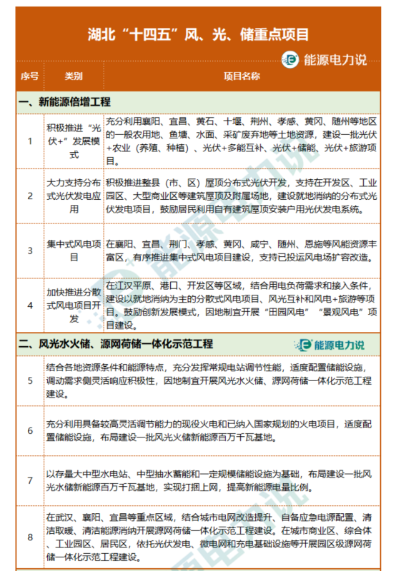 “十四五”期間,湖北將在新能源倍增工程、風(fēng)光水火儲、源網(wǎng)荷儲一體化示范工程、數(shù)字能源工程、抽水蓄能電站建設(shè)重點、能源裝備產(chǎn)業(yè)發(fā)展重點等方面建設(shè)重點項目。
