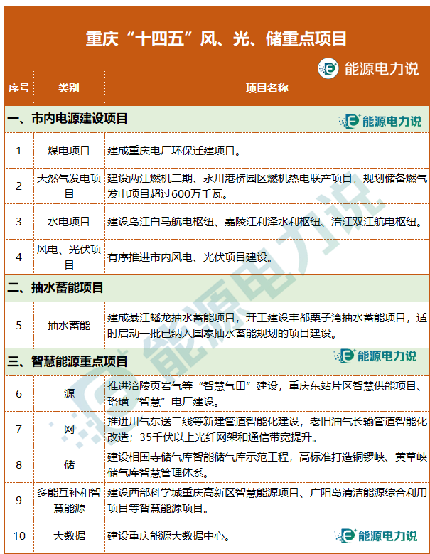 “十四五”期間,有序推進市內(nèi)風(fēng)電、光伏項目建設(shè);建成綦江蟠龍抽水蓄能項目,開工建設(shè)豐都栗子灣抽水蓄能項目,適時啟動一批已納入國家抽水蓄能規(guī)劃的項目建設(shè);建設(shè)西部科學(xué)城重慶高新區(qū)智慧能源項目、廣陽島清潔能源綜合利用項目等智慧能源項目等。