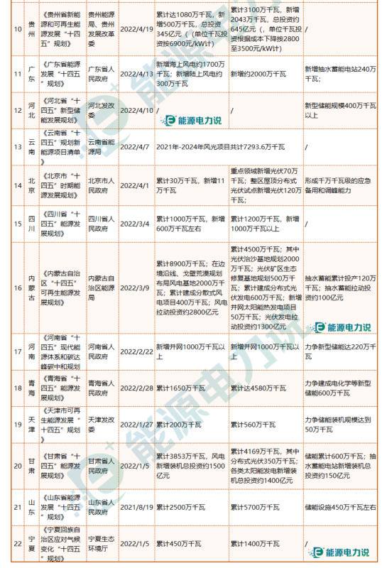 中國儲能網(wǎng)訊:2022年以來,各省陸續(xù)發(fā)布“十四五”可再生能源規(guī)劃、能源規(guī)劃、新型儲能規(guī)劃等相關(guān)文件,其風(fēng)電、光伏、儲能“十四五”發(fā)展目標(biāo)及重點項目也隨之公布。