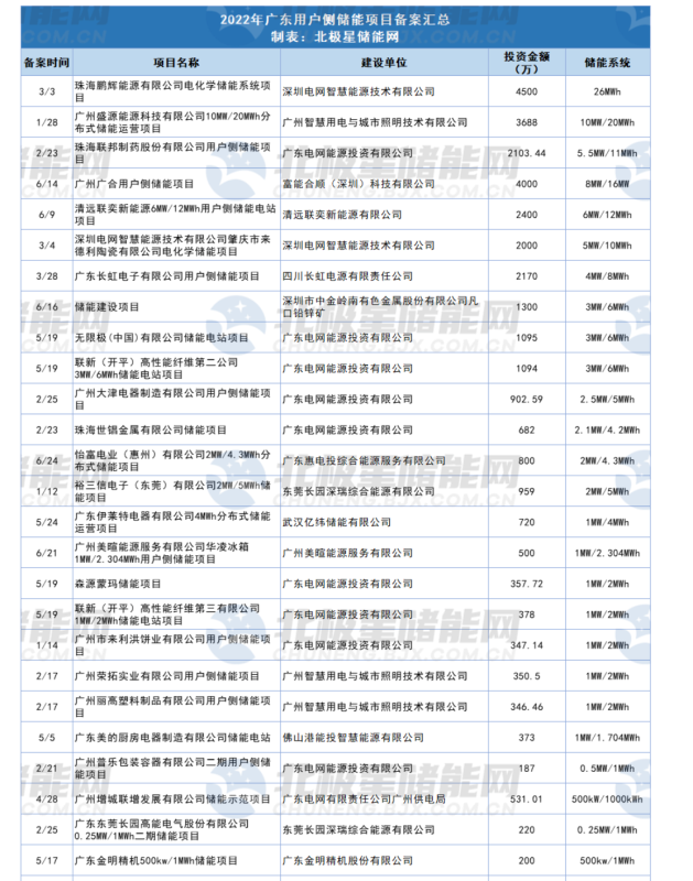 中國儲能網(wǎng)訊:2022年以來,廣東共有67個儲能項目進行了備案,儲能投資金額超22億,儲能總規(guī)模超4.8GW/10.04GWh。投資方向出現(xiàn)兩極分化,寧德時代、中廣核等企業(yè)主要投資大規(guī)模儲能,不斷突破儲能規(guī)模上線,而南方電網(wǎng)等企業(yè)則廣鋪用戶側(cè)儲能,側(cè)重服務(wù)市場應(yīng)用。