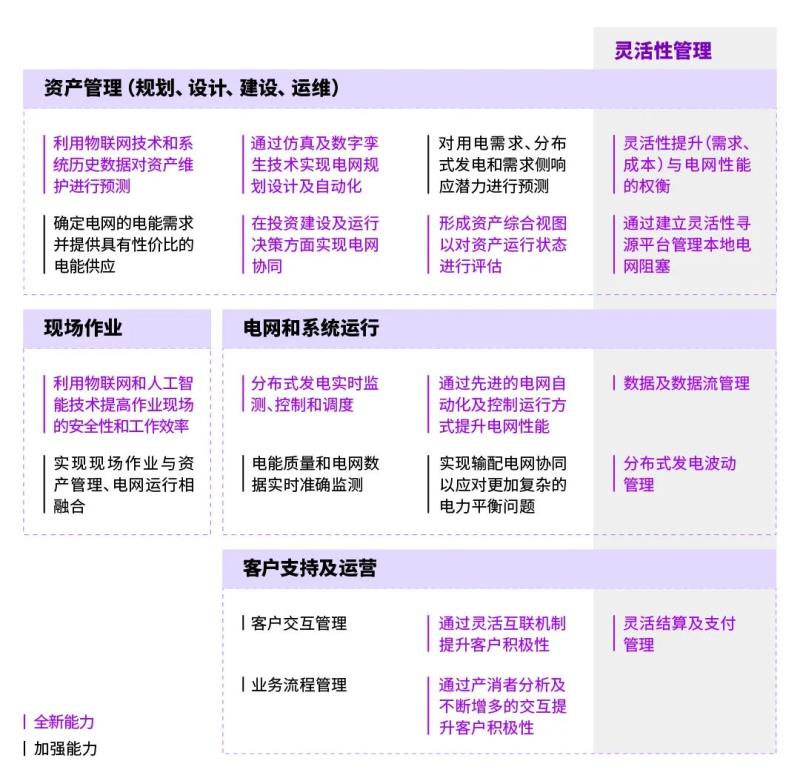 軟實力是價值實現(xiàn)的必要條件。在推動基礎(chǔ)要素升級的同時,電網(wǎng)企業(yè)需要著力打造駕馭新型電力系統(tǒng)的運營架構(gòu)和能力體系。埃森哲建議電網(wǎng)企業(yè)可以借助國際先進(jìn)電網(wǎng)企業(yè)的運營能力框架,圍繞資產(chǎn)管理、現(xiàn)場作業(yè)、電網(wǎng)和系統(tǒng)運行、客戶支持及運營等領(lǐng)域多管齊下,系統(tǒng)分析并逐一梳理各項業(yè)務(wù)在新型電力系統(tǒng)建設(shè)要求下的提升方向和優(yōu)化需求。