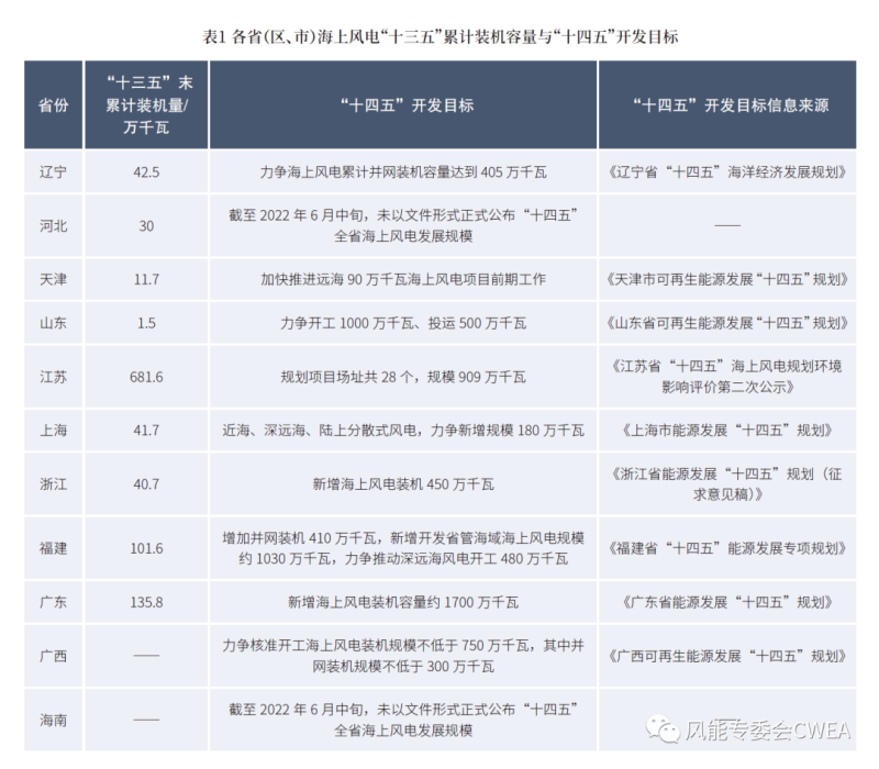 據(jù)統(tǒng)計(jì),截至2022年6月中旬,我國(guó)共有9個(gè)?。▍^(qū)、市)通過文件形式公布或征求過“十四五”海上風(fēng)電的具體發(fā)展規(guī)模相關(guān)意見。另有1個(gè)省份通過非正式下發(fā)文件的形式,透露自身的“十四五”海上風(fēng)電發(fā)展規(guī)模。為方便讀者參考,本文對(duì)各省(區(qū)、市)“十四五”海上風(fēng)電裝機(jī)規(guī)模的具體目標(biāo)進(jìn)行了整理與匯編。