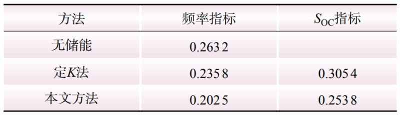 由表2中數(shù)據(jù)可以看出,連續(xù)負(fù)荷擾動(dòng)工況下無儲能調(diào)頻效果最弱,本文策略略優(yōu)于定K法,并且對于Q指標(biāo),本文所提方法考慮電池狀態(tài)對出力深度的影響,仿真結(jié)果顯示較好。由于大量新能源發(fā)電并網(wǎng),電網(wǎng)頻率擾動(dòng)的次數(shù)更加頻繁,儲能調(diào)頻更應(yīng)在安全的前提下利用好本身能量轉(zhuǎn)換的優(yōu)勢。