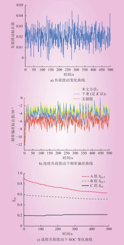 儲能參與電網(wǎng)調(diào)頻作用時(shí)間較短,為了使仿真結(jié)果更加明顯,體現(xiàn)本文控制策略的作用效果,故將A組儲能單元初始SOC設(shè)為臨界充電狀態(tài)0.9,B組SOC設(shè)為0.6,C組SOC設(shè)為臨界放電狀態(tài)0.2。因?yàn)閮δ茌o助電網(wǎng)一次調(diào)頻主要是應(yīng)對較小幅度的負(fù)荷擾動(dòng),通常約為負(fù)荷峰值的1%,因此,本文假設(shè)連續(xù)負(fù)荷的變動(dòng)平均幅值為1%~3%。