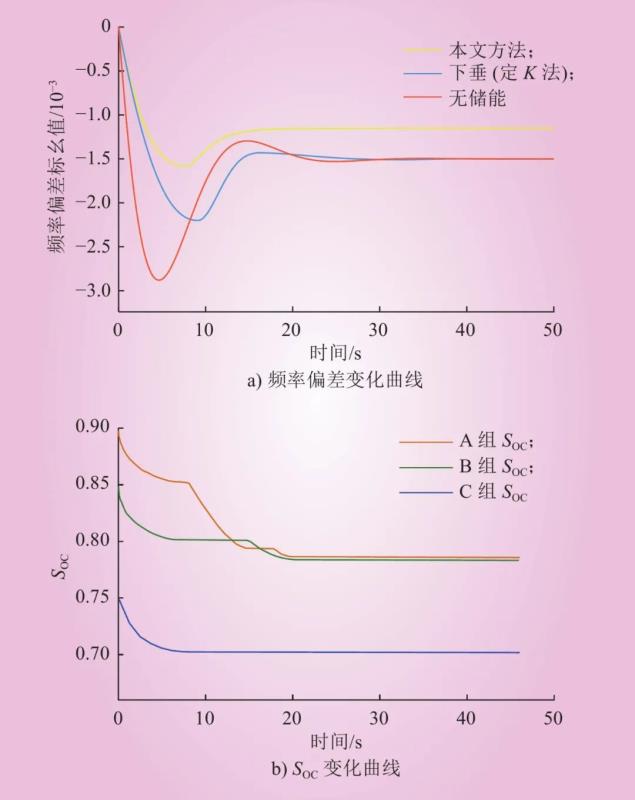 由圖8 b)可知,在連續(xù)負(fù)荷擾動(dòng)下,本文所提控制策略對比無儲能和采用下垂定K法,頻率偏差的情況明顯降低,更好的保障電網(wǎng)安全穩(wěn)定運(yùn)行。由圖8 c)可知,由于A組儲能單元處于臨界放電狀態(tài),相較于B組放電功率更大,SOC下降更快,C組處于臨界充電狀態(tài),在系統(tǒng)功率缺額時(shí)不參與工作,僅在系統(tǒng)功率過剩時(shí)投入工作,避免電池出現(xiàn)過放情況,最終各儲能單元組的荷電狀態(tài)均向健康的工作狀態(tài)變化。對比其他單一儲能單元的控制方法,本文方法考慮實(shí)際工況,更適用于工程應(yīng)用,避免電池過充過放情況發(fā)生的同時(shí)也達(dá)到了較好的調(diào)頻效果,驗(yàn)證了本文控制策略的有效性。