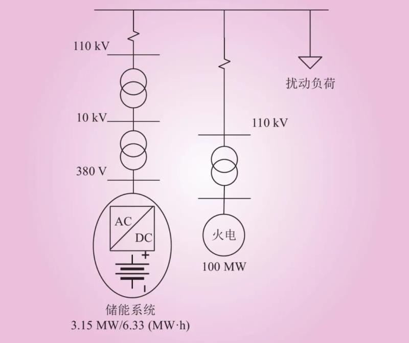 系統(tǒng)額定頻率為50 Hz,包括1臺額定容量為100 MW的傳統(tǒng)火電機(jī)組,3組儲能單元并聯(lián)組成額定容量為3.15 MW/6.33 (MW·h)的儲能系統(tǒng),其額定電壓為380 V,系統(tǒng)仿真示意如圖6所示,參數(shù)標(biāo)幺值是以額定頻率50 Hz和傳統(tǒng)機(jī)組額定容量作為基準(zhǔn)值。為了說明本方法的適用性,以2種不同工況進(jìn)行分析說明。