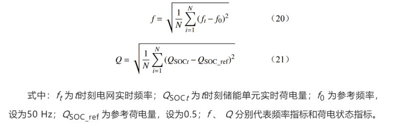 在連續(xù)負(fù)荷擾動(dòng)的工況下,主要將頻率偏差和荷電狀態(tài)偏差的均方根值作為一次調(diào)頻的評價(jià)指標(biāo),以此來反映一次調(diào)頻效果和儲能單元的電量健康。