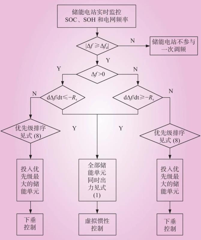 根據(jù)以上分析,本文策略在擾動(dòng)初期頻率變化率大時(shí)采用引入健康因子的虛擬慣性控制以減緩頻率惡化速度及惡化程度;在渡過頻率惡化期后采用系數(shù)可變的下垂控制并結(jié)合SOC、SOH估計(jì)對各儲能單元組進(jìn)行優(yōu)先級排序,響應(yīng)電網(wǎng)頻率波動(dòng)時(shí),將優(yōu)先級高的儲能單元組投入工作既能保證調(diào)頻效果又能保證儲能電站的經(jīng)濟(jì)性和安全性。在調(diào)頻死區(qū)外,當(dāng)頻率偏差 Δf>0(Δf<0) 時(shí),若頻率偏差率 dft/dt>0(dft/dt<0) 則啟動(dòng)虛擬慣性控制,所有儲能單元同時(shí)出力,迅速阻止頻率進(jìn)一步惡化,若頻率偏差率 dft/dt<0(dft/dt>0) 則啟動(dòng)下垂控制,根據(jù)各儲能單元SOC、SOH對儲能變流器(power conversion system,PCS)選擇投切,2種控制相互配合最終實(shí)現(xiàn)頻率的快速恢復(fù)。