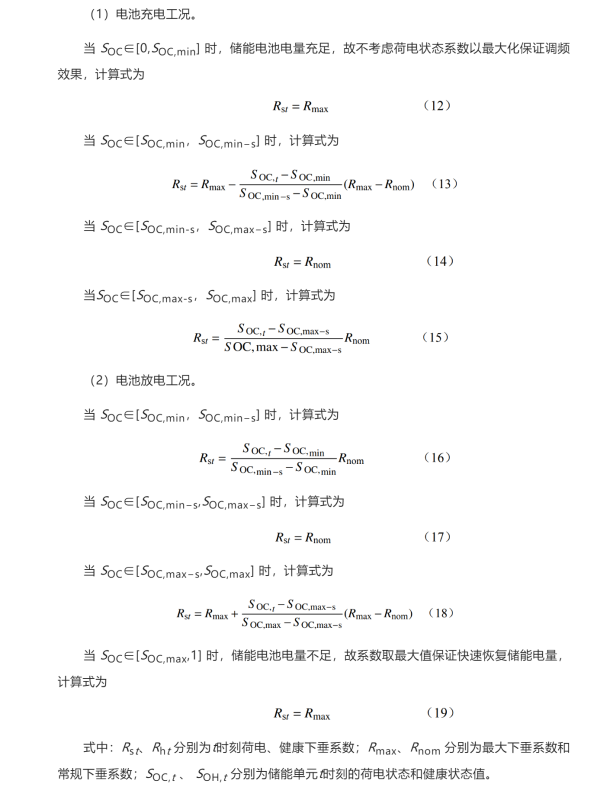 目前,國內(nèi)外學(xué)者對參與電網(wǎng)一次調(diào)頻的儲能電站控制策略進(jìn)行了大量研究。文獻(xiàn)[15]建立了符合調(diào)頻需求的儲能電池模型,提出儲能調(diào)頻輸出功率調(diào)節(jié)模式,并體現(xiàn)了相比傳統(tǒng)機(jī)組的優(yōu)勢。文獻(xiàn)[16]在下垂控制中采用恒定的下垂系數(shù),沒有考慮電池荷電狀態(tài)(state of charge,SOC)對儲能輸出功率的影響。當(dāng)前針對大規(guī)模儲能電站輔助電網(wǎng)調(diào)頻的研究多采用定系數(shù)法,連續(xù)負(fù)荷擾動(dòng)可能使儲能單元產(chǎn)生過充過放現(xiàn)象,進(jìn)而發(fā)生不可控安全事故,考慮經(jīng)濟(jì)性,當(dāng)前電池儲能成本較高,對電池控制不當(dāng)會(huì)影響儲能系統(tǒng)長時(shí)間可持續(xù)發(fā)展。文獻(xiàn)[17-18]均考慮到電池SOC,分別提出變系數(shù)下垂控制與自適應(yīng)下垂控制,更好地調(diào)整電池出力。文獻(xiàn)[19]為緩解擾動(dòng)初期頻率惡化程度,新增虛擬慣性控制,但配合下垂控制僅設(shè)置時(shí)間延遲,一次調(diào)頻效果略有不足。現(xiàn)有研究都是將儲能系統(tǒng)看作一個(gè)整體進(jìn)行能量調(diào)度,沒有考慮健康狀態(tài)(state of health,SOH)對電池充放電的影響,缺少對儲能系統(tǒng)內(nèi)部結(jié)構(gòu)的考慮,而實(shí)際工程中儲能電站是由多組電池簇并聯(lián)組成。